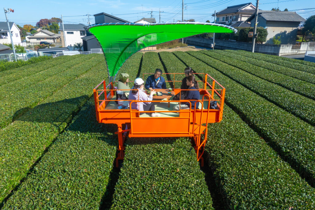 茶畑の上をすべるように移動する「乗用茶刈機」が移動する床ならば、そこは人が過ごす空間になり得る。この視点の転換から、茶畑の真ん中に、畳の空間を出現させるというアイデアが生まれた。